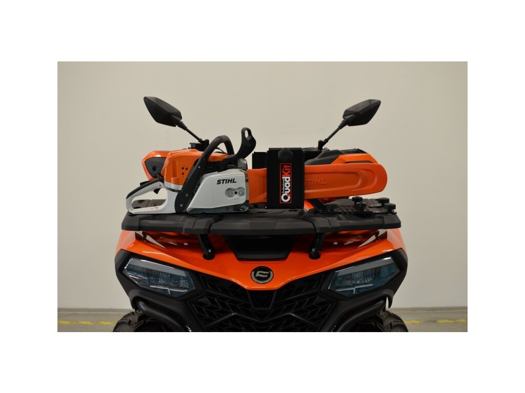 Univerzální držák motorové pily na čtyřkolku nebo UTV. Unikátní konstrukce umožňuje instalovat držák horizontálně, vertikálně nebo pod úhlem 45° na trubkové i plastové nosiče.